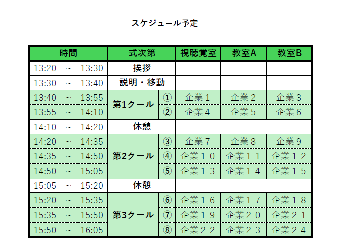 参加企業を3つのクールに分け、さらに1クール内で4つのグループに分ける。1クールに参加できる企業は8社程度を想定する。(※)
