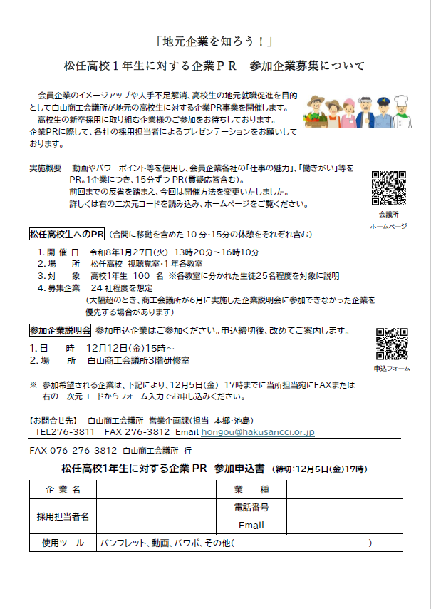 【事業】「地元企業を知ろう!松任高校1年生対象企業説明会」参加企業募集のお知らせ(開催日:令和8年1月27日(火))(申込期間:11月17日(月)~12月5日(金))
