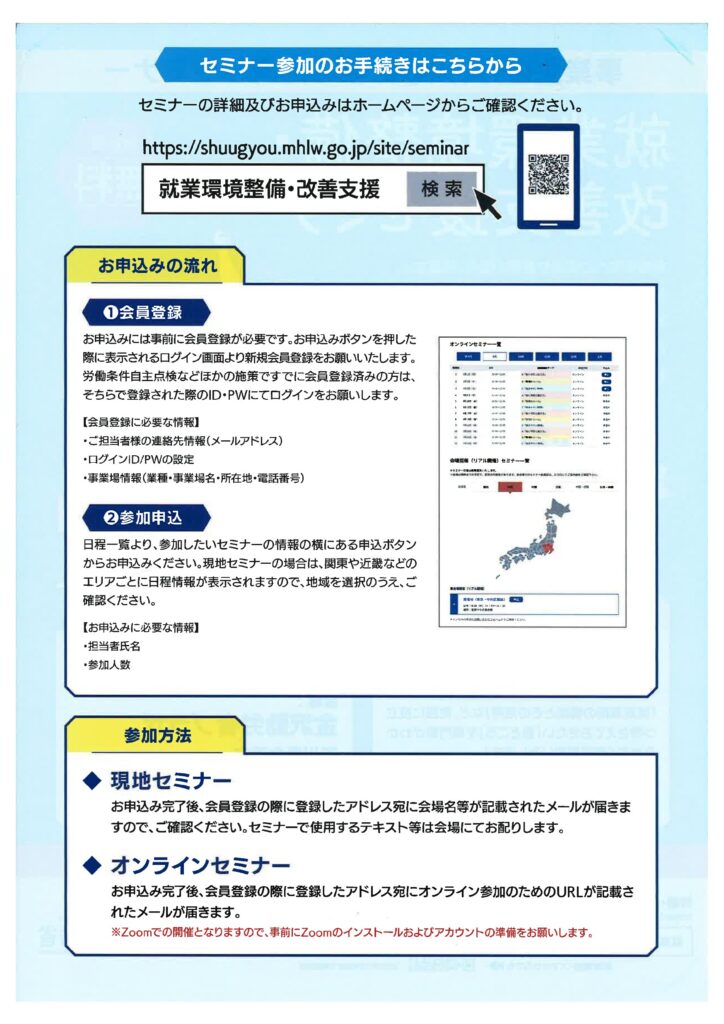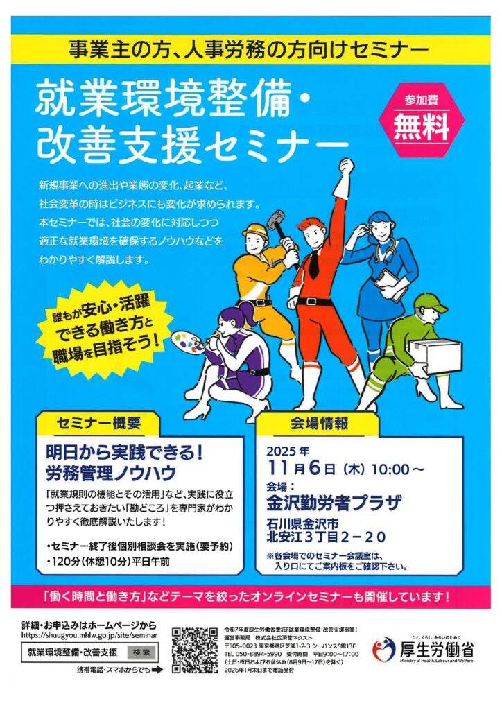【外部セミナー】「就業環境整備・改善支援セミナー」のご案内(開催日:11月6日(木))(主催:厚生労働省)