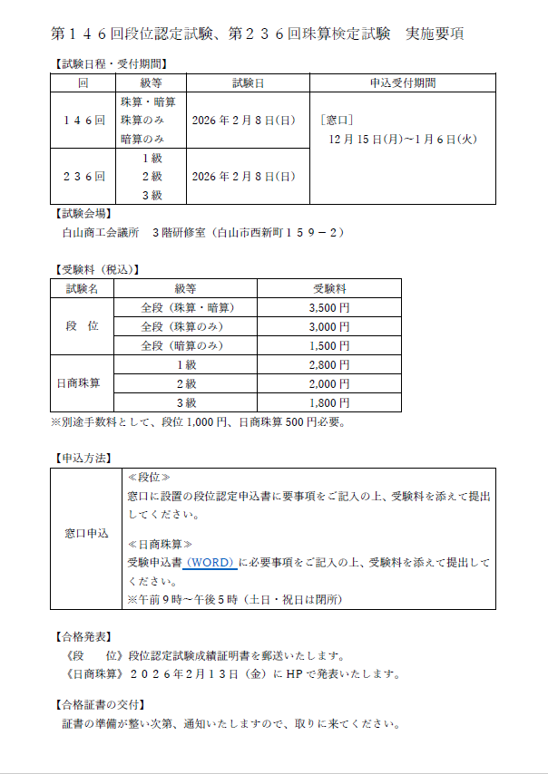 【検定】第146回段位認定試験、第236回日商珠算検定試験施行のご案内(開催日:令和8年2月8日(日))(受付:12月15日(月)~令和8年1月6日(火))