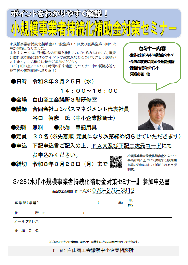 「小規模事業者持続化補助金対策セミナー」 3月25日(水)14:00~16:00