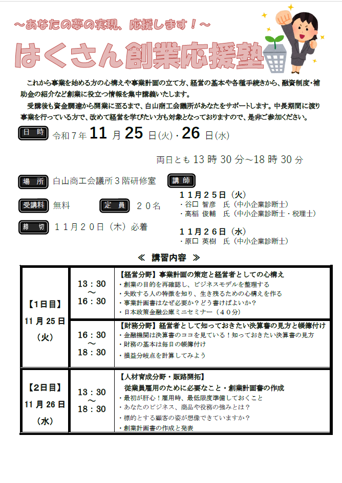 「はくさん創業応援塾」開催決定!詳細はこちら